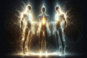 Levitating human souls in heaven. Astral body and after life concept. Transfer of human consciousness to another world. Created with Generative AI