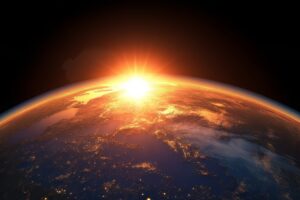 Sunrise view of the planet Earth from space with the sun setting over the horizon